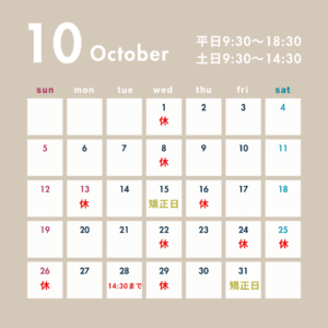 10月の診療日はご覧の通りとなっております。